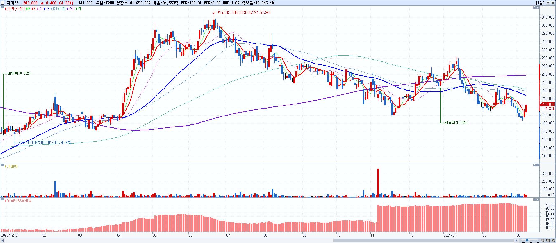 - 하이브 (203,000원 ▲ 4.32% , 시총: 84,554억, 외국인 순매수 거래금:42억)