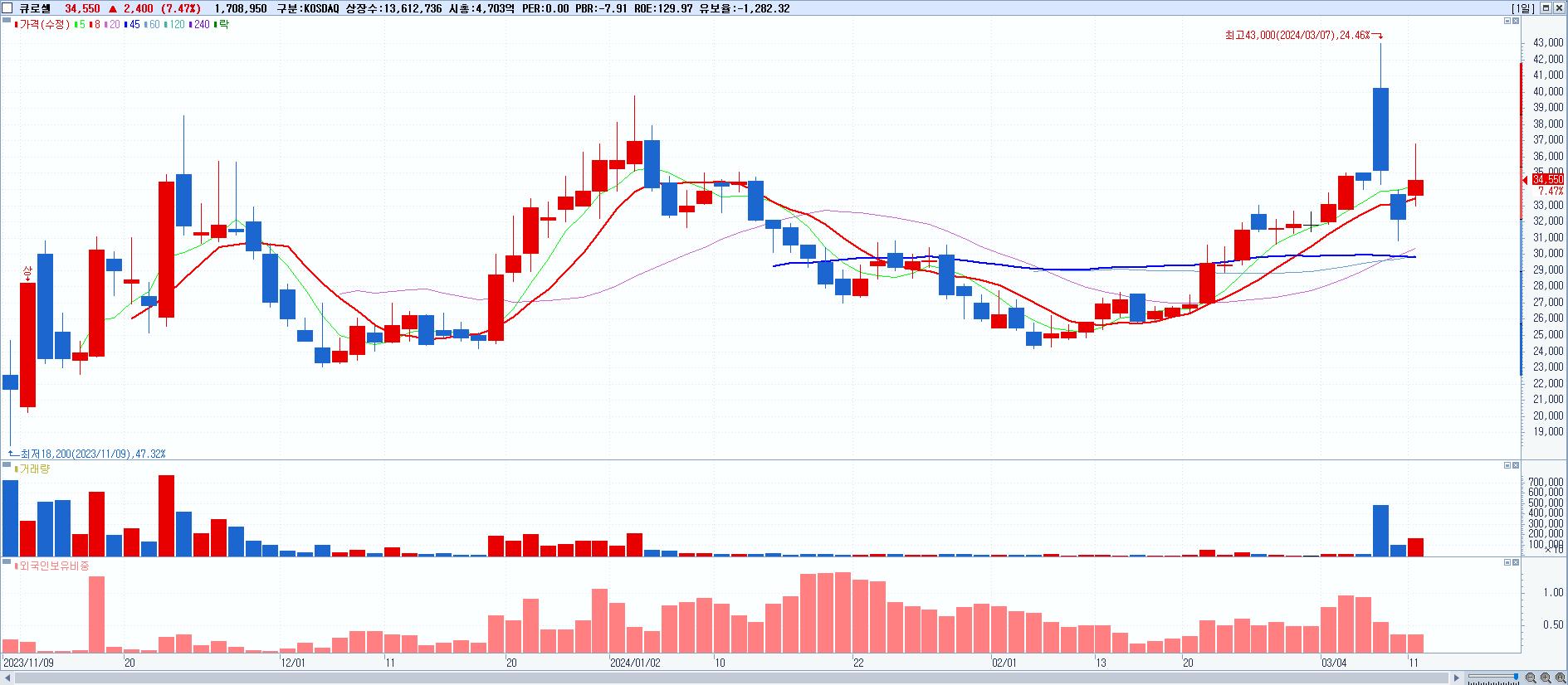 - 큐로셀 (34,550원 ▲ 7.47% , 시총: 4,703억, 외국인 순매수 거래금:42억)