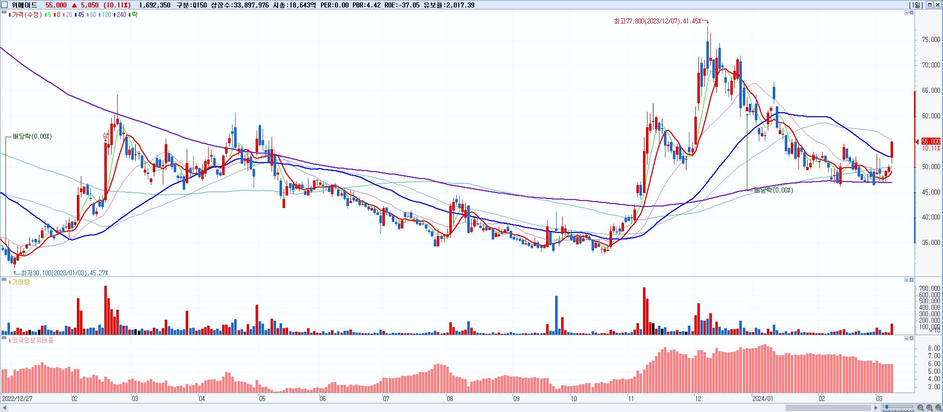 - 위메이드 (55,000원 ▲ 10.11% , 시총: 18,644억, 외국인 순매수 거래금:98억)
