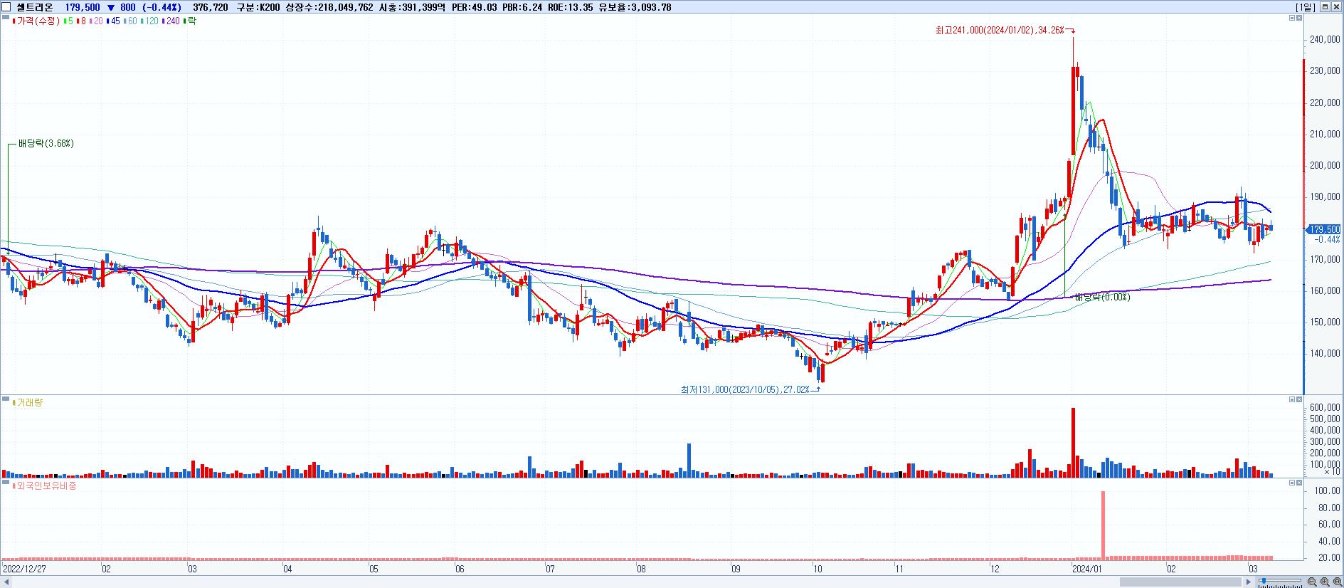 - 셀트리온 (179,500원 ▼ -0.44% , 시총: 391,399억, 외국인 순매수 거래금:40억)