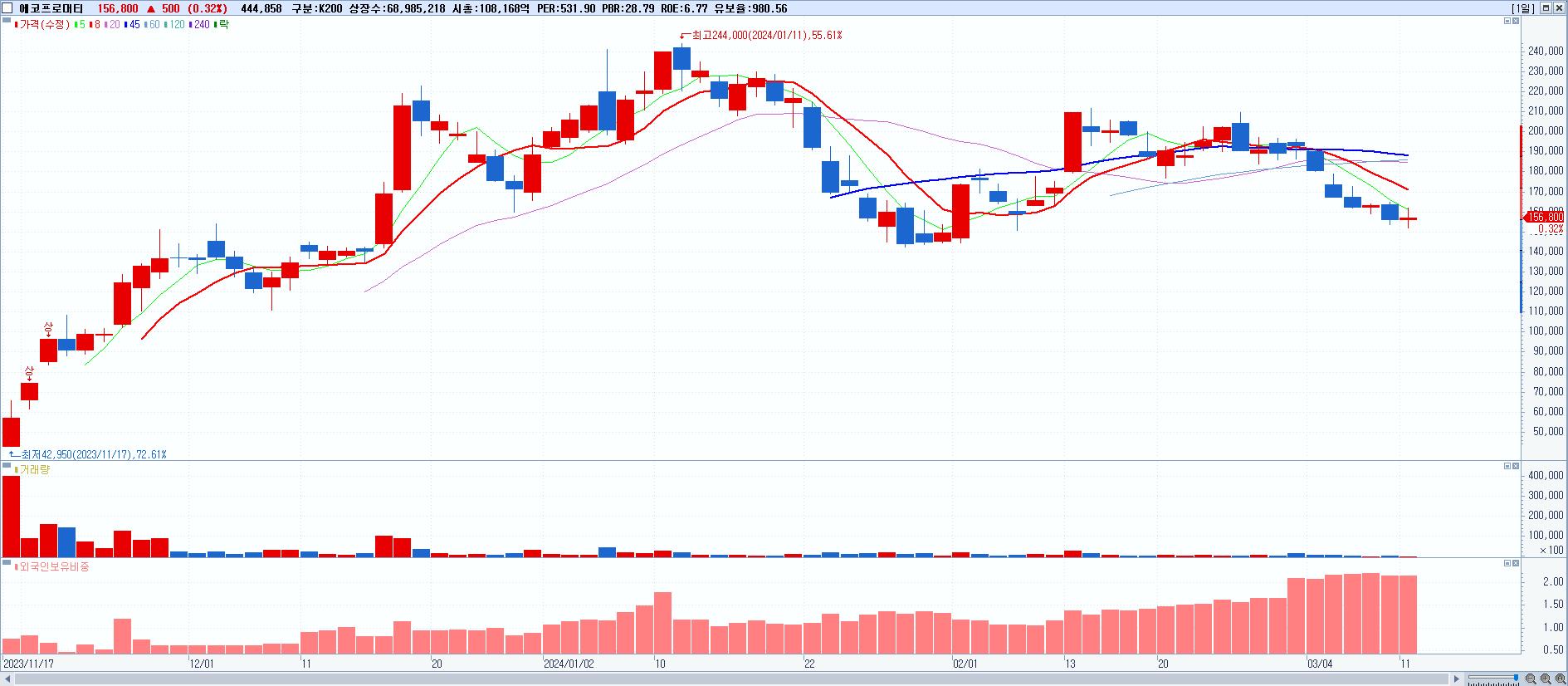 29.에코프로머티 156,800원 ▲ 0.32% (KOSPI, 450080)