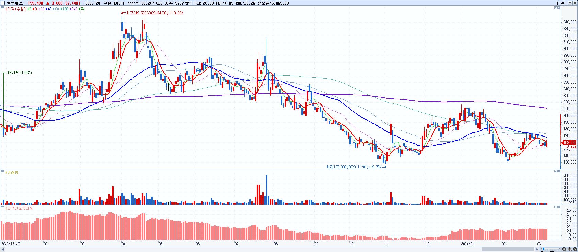 - 엘앤에프 (159,400원 ▲ 2.44% , 시총: 57,779억, 외국인 순매수 거래금:111억)