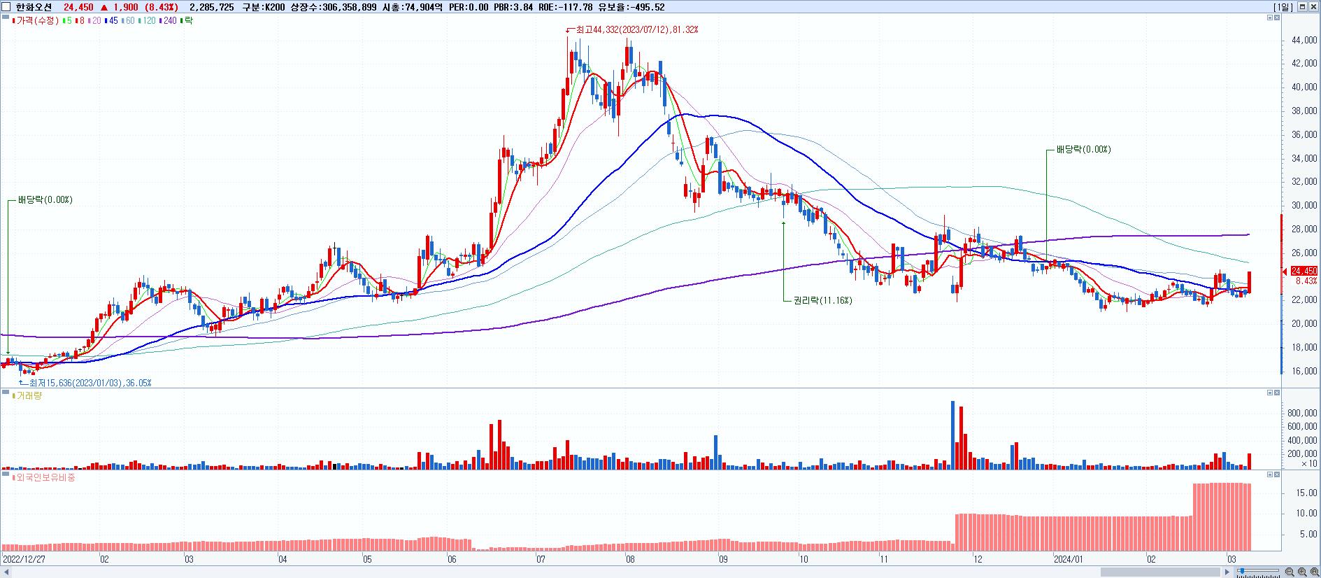 - 한화오션 (24,450원 ▲ 8.43% , 시총: 74,905억, 외국인 순매수 거래금:102억)
