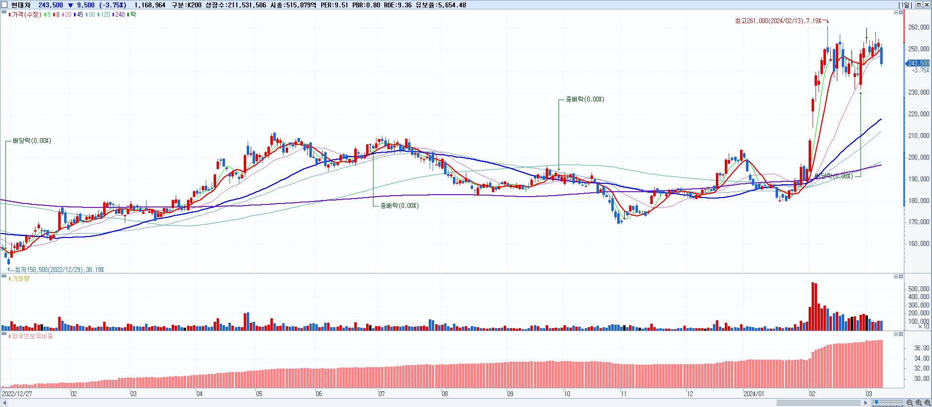 - 현대차 (243,500원 ▼ -3.75% , 시총: 515,079억, 외국인 순매수 거래금:72억)