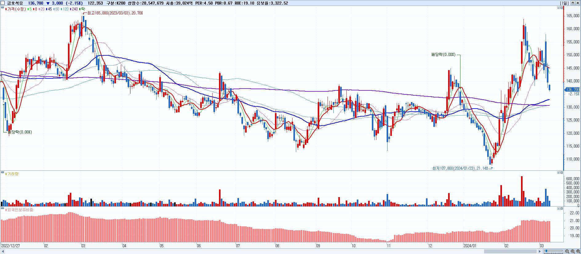 - 금호석유 (136,700원 ▼ -2.15% , 시총: 39,025억, 외국인 순매수 거래금:51억)