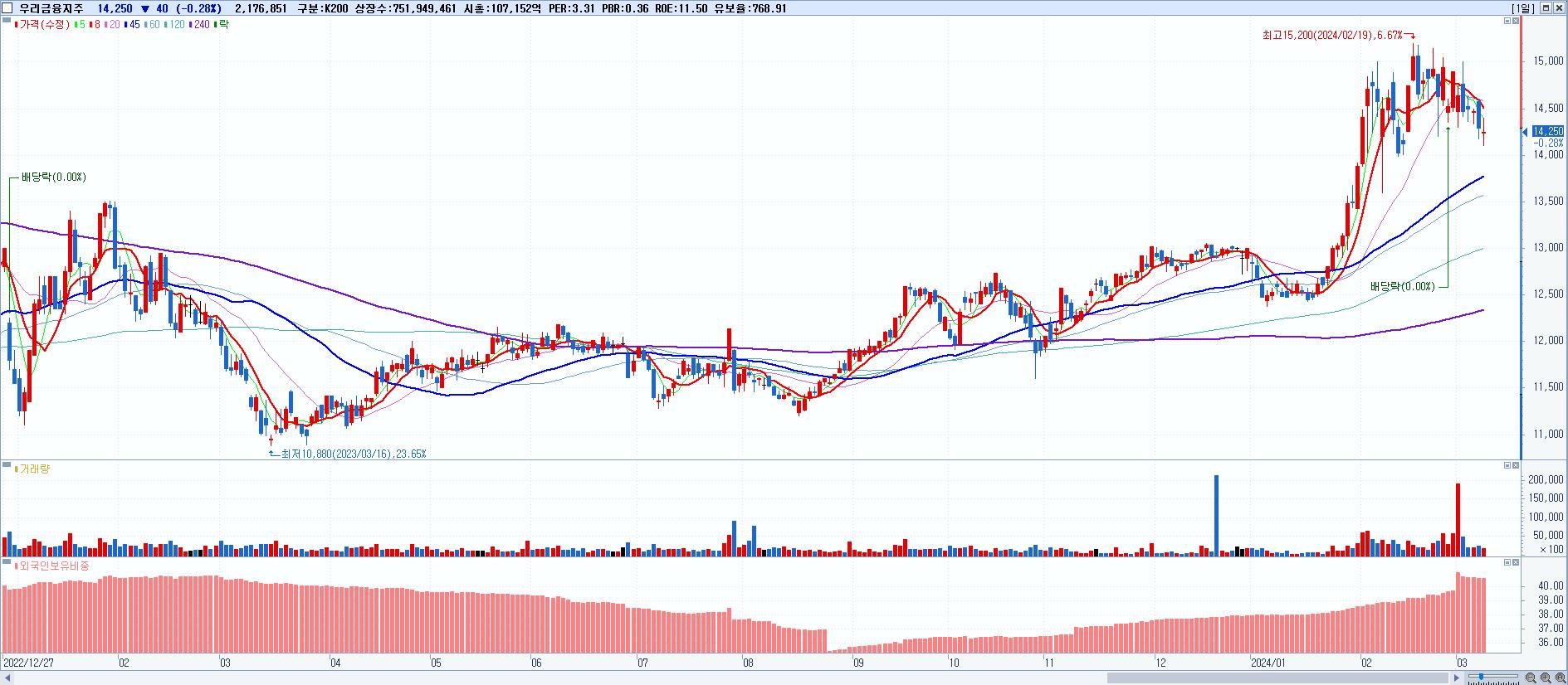 - 우리금융지주 (14,250원 ▼ -0.28% , 시총: 107,153억, 외국인 순매수 거래금:65억)