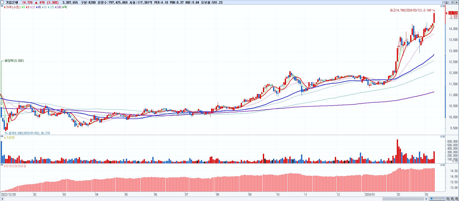 - 기업은행 (14,720원 ▲ 3.3% , 시총: 117,381억, 거래량: 3,307,655, 거래대금:483억, KOSPI)