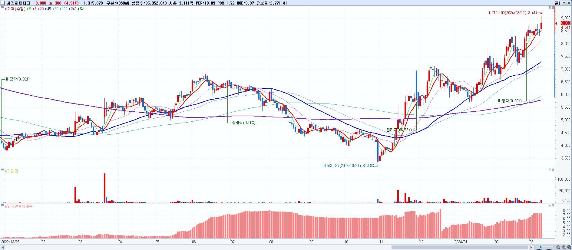 - 세경하이테크 (8,800원 ▲ 4.51% , 시총: 3,111억, 거래량: 1,315,078, 거래대금:116억, KOSDAQ)