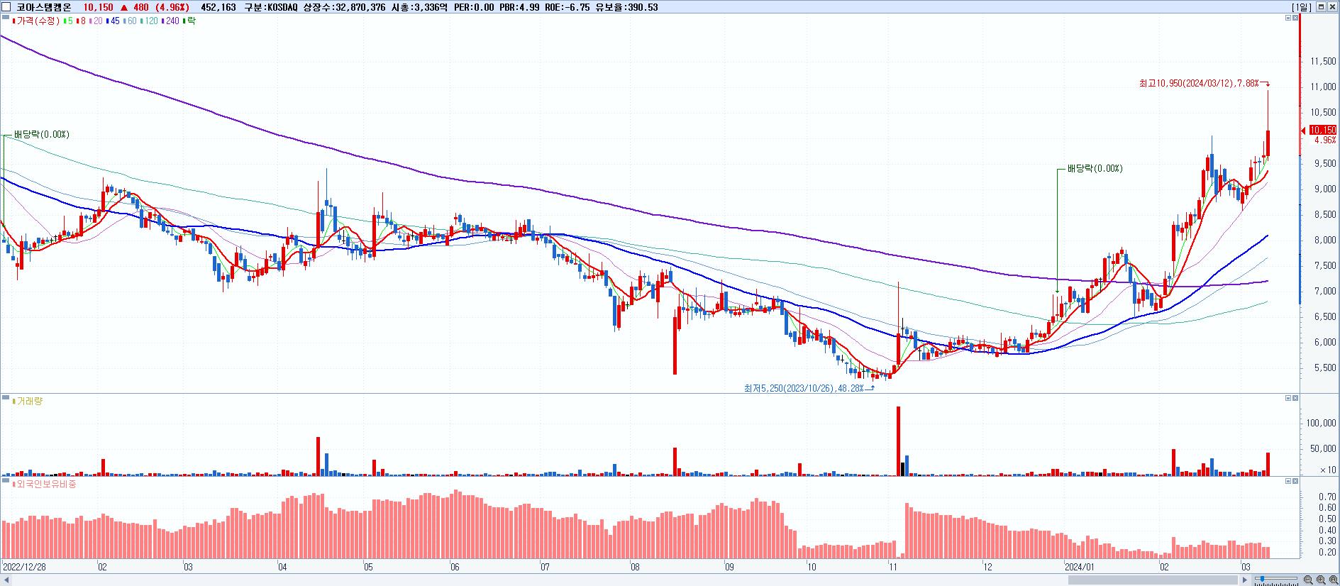 - 코아스템켐온 (10,150원 ▲ 4.96% , 시총: 3,336억, 거래량: 452,163, 거래대금:47억, KOSDAQ)