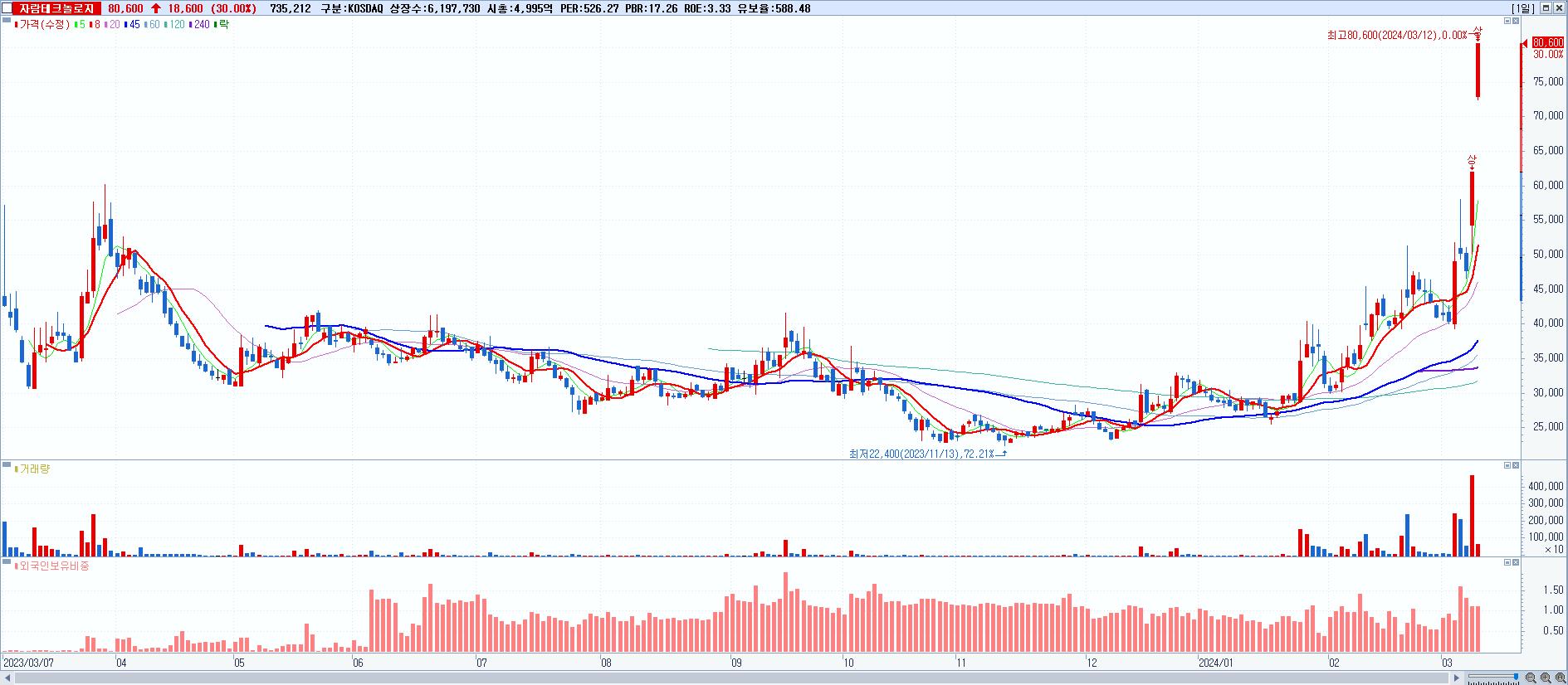 - 자람테크놀로지 (80,600원 ▲ 30% , 시총: 4,995억, 거래량: 735,212, 거래대금:568억, KOSDAQ)