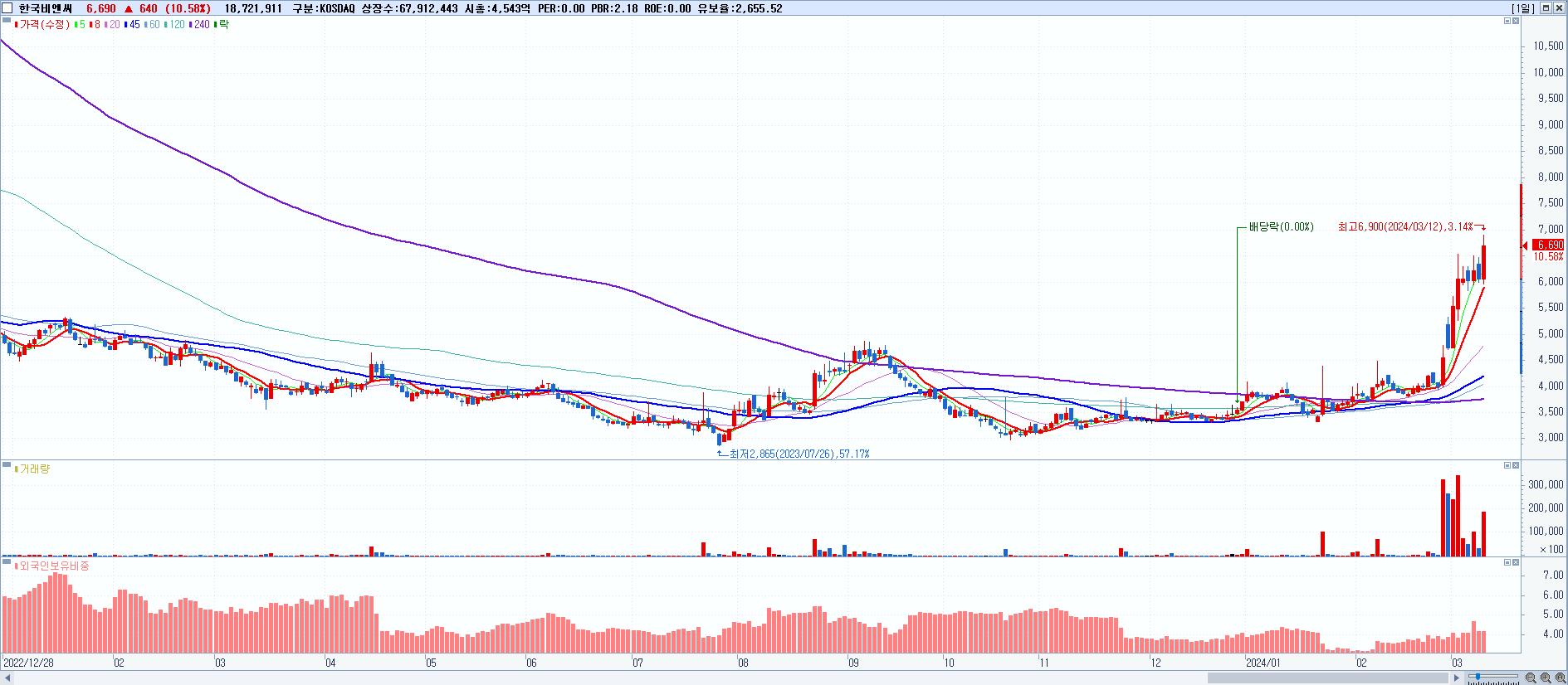 - 한국비엔씨 (6,690원 ▲ 10.58% , 시총: 4,543억, 거래량: 18,721,911, 거래대금:1,244억, KOSDAQ)