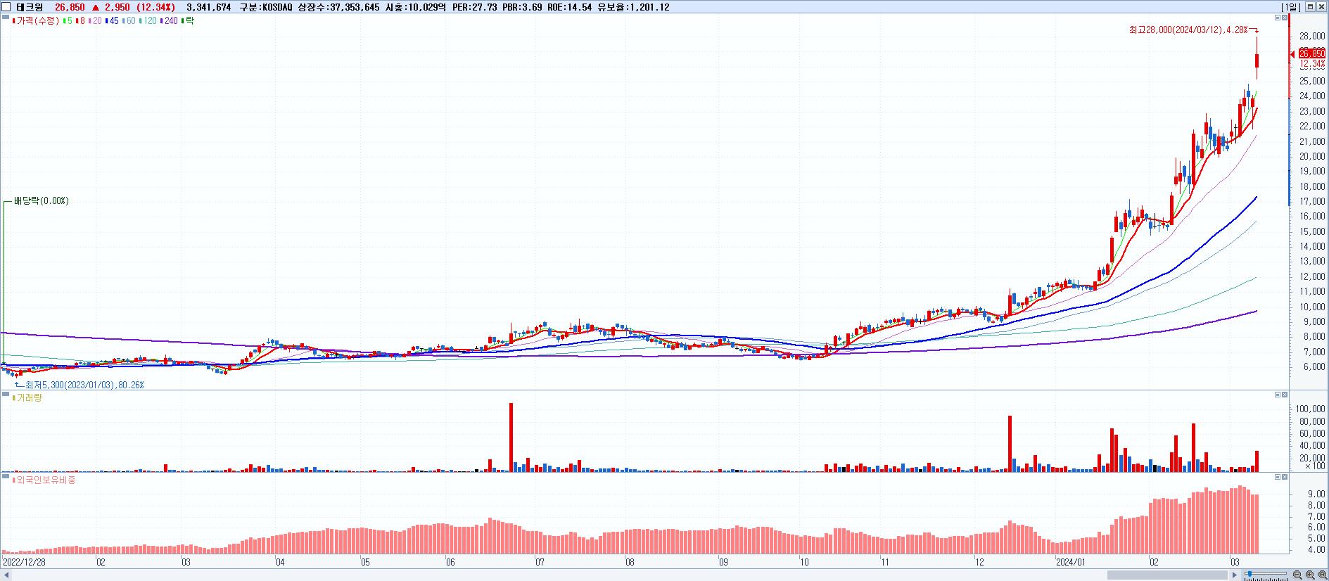 - 테크윙 (26,850원 ▲ 12.34% , 시총: 10,029억, 거래량: 3,341,674, 거래대금:900억, KOSDAQ)