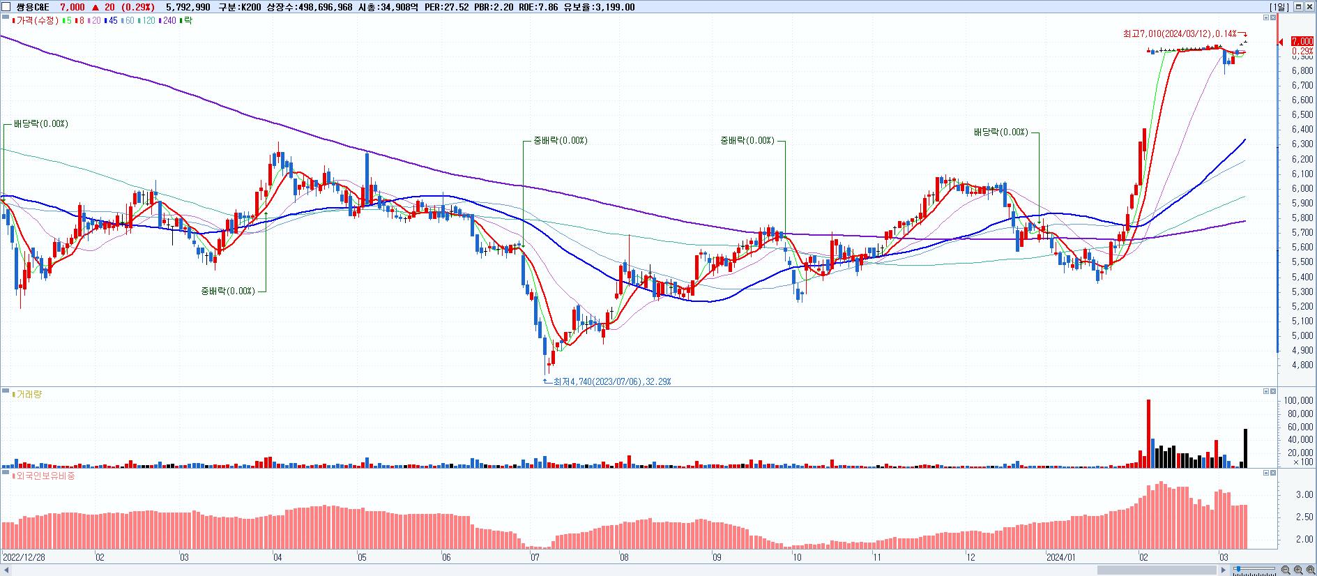쌍용C&E 7,000원 ▲ 0.29% (KOSPI, 003410)