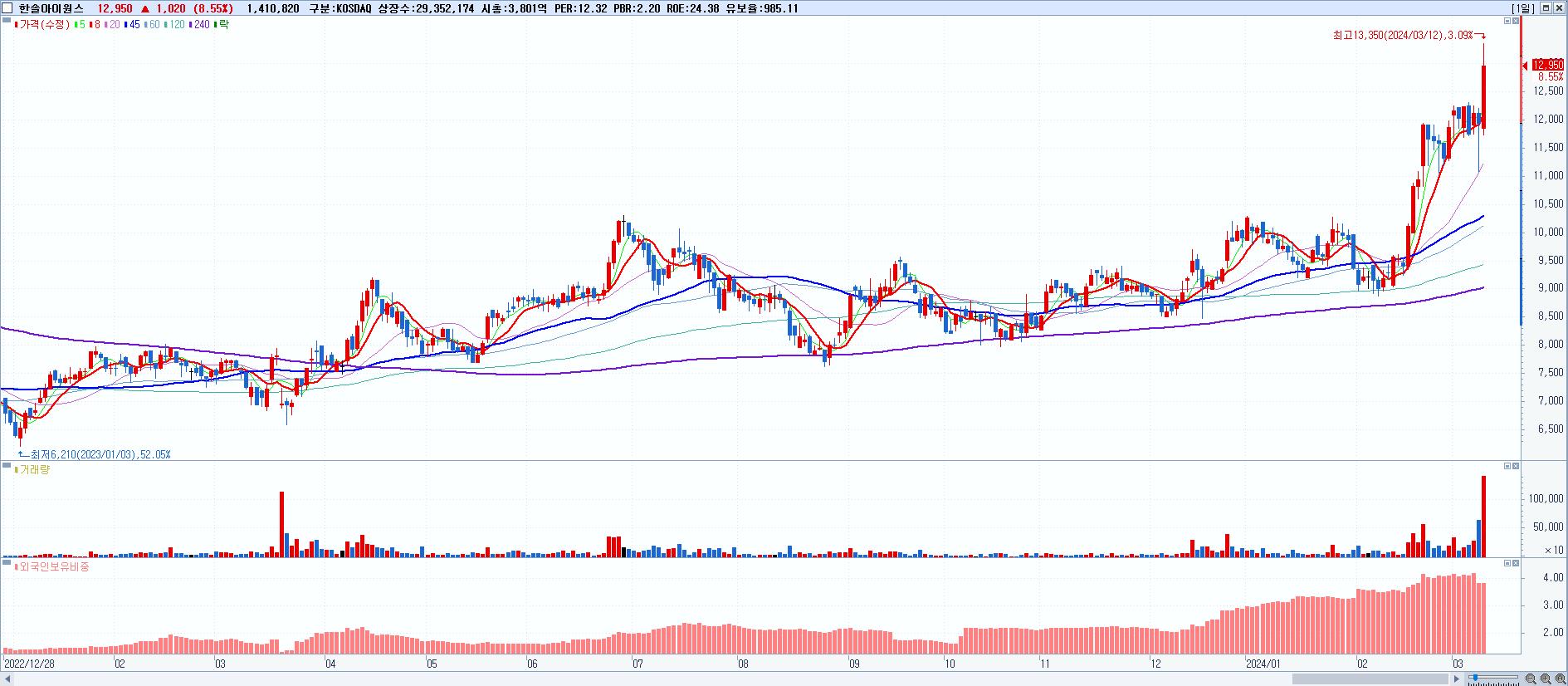 - 한솔아이원스 (12,950원 ▲ 8.55% , 시총: 3,801억, 거래량: 1,410,820, 거래대금:181억, KOSDAQ)