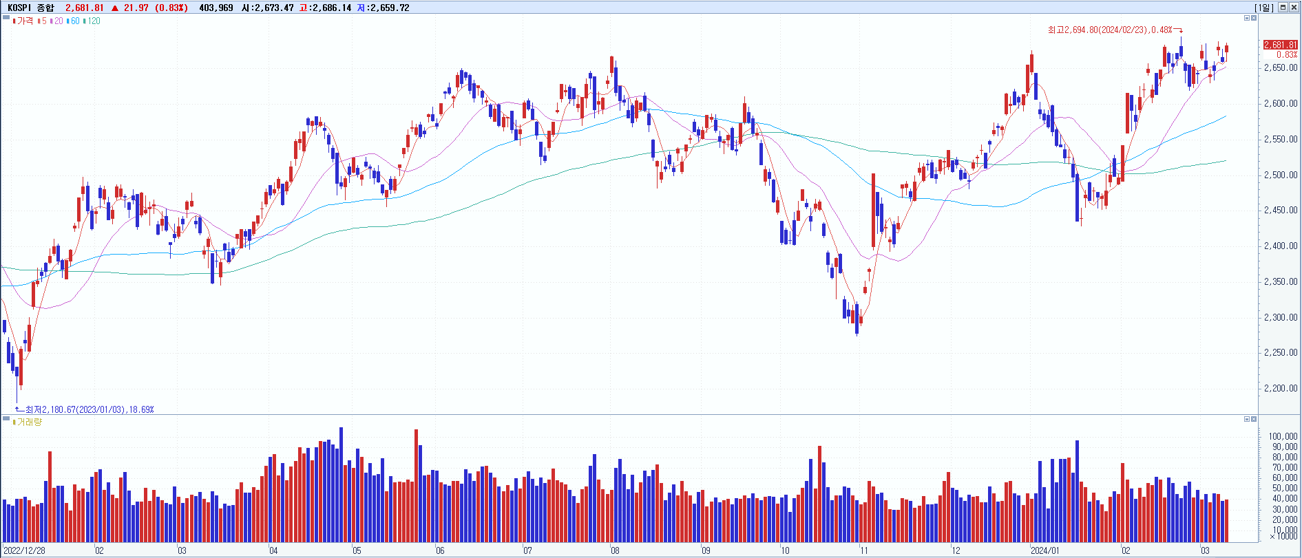 - 코스피는 약 22개월 만에 최고치를 경신하며 2700선에 근접