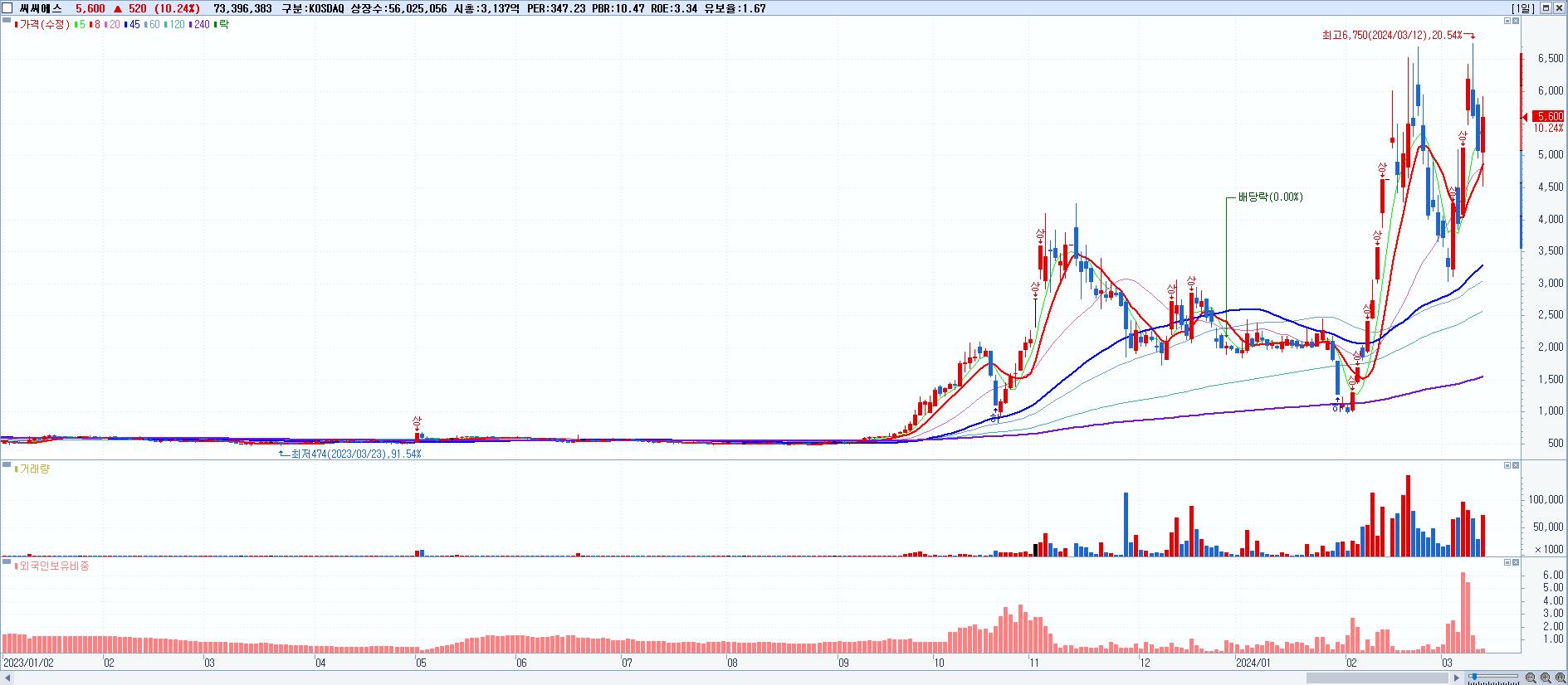 - 씨씨에스 (5,600원 ▲ 10.24% , 시총: 3,137억, 거래량: 73,396,383, 거래대금:3,927억)