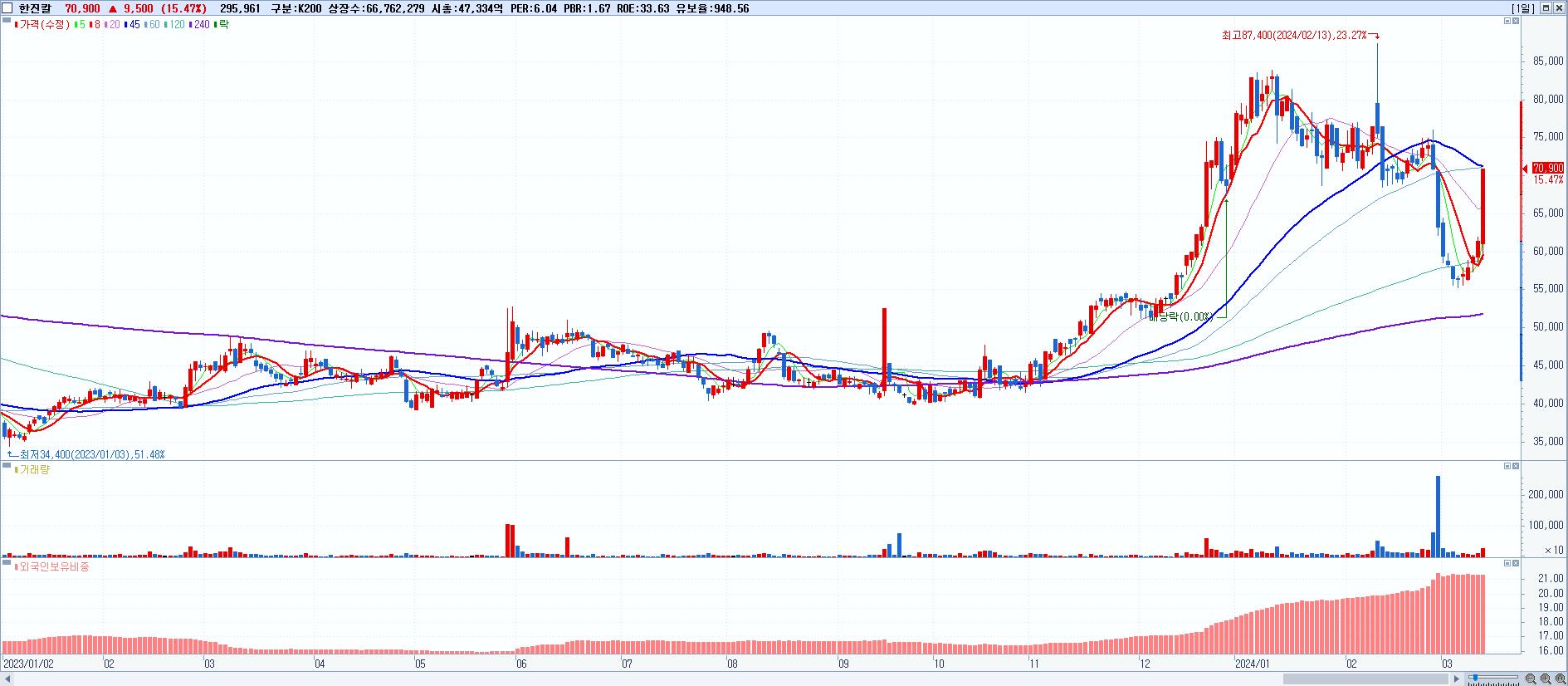 - 한진칼 (70,900원 ▲ 15.47% , 시총: 47,334억, 거래량: 295,961, 거래대금:192억)