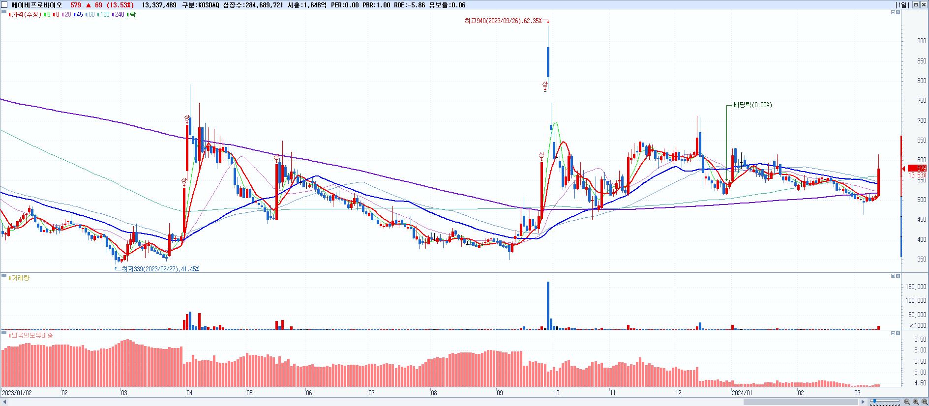 - 에이비프로바이오 (579원 ▲ 13.53% , 시총: 1,648억, 거래량: 13,337,489, 거래대금:77억)