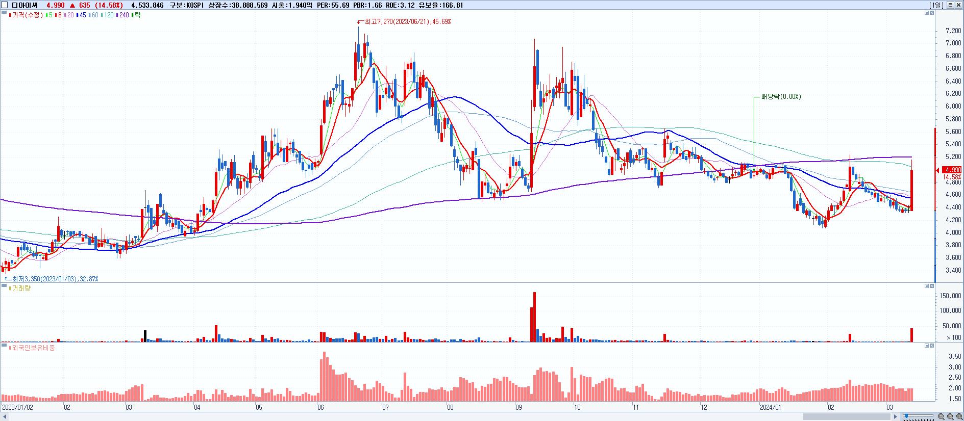 - 디아이씨 (4,990원 ▲ 14.58% , 시총: 1,941억, 거래량: 4,533,846, 거래대금:225억)