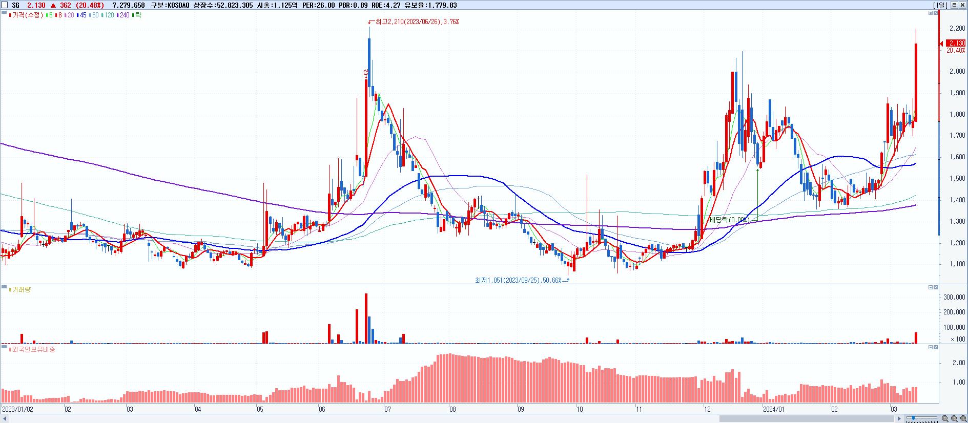 - SG (2,130원 ▲ 20.48% , 시총: 1,125억, 거래량: 7,279,658, 거래대금:150억)