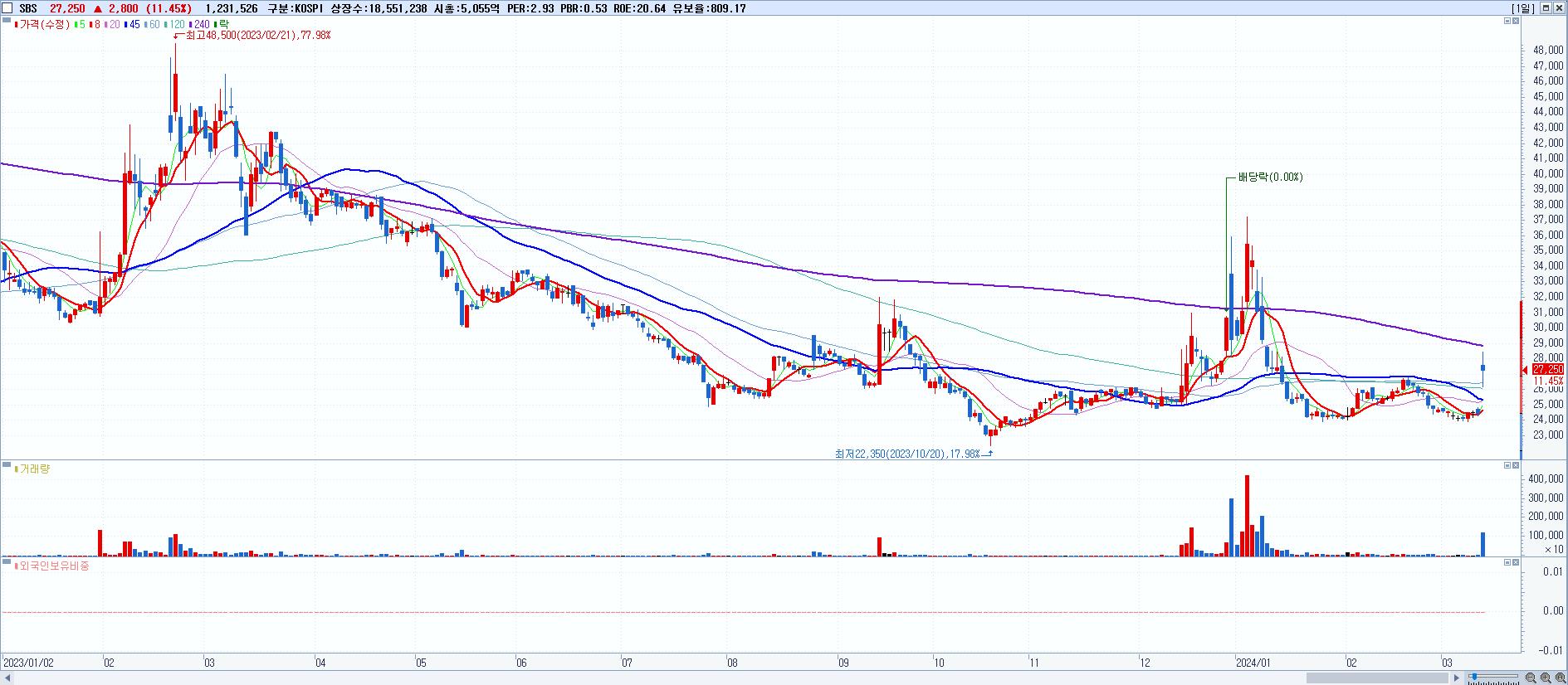 - SBS (27,250원 ▲ 11.45% , 시총: 5,055억, 거래량: 1,231,526, 거래대금:336억)