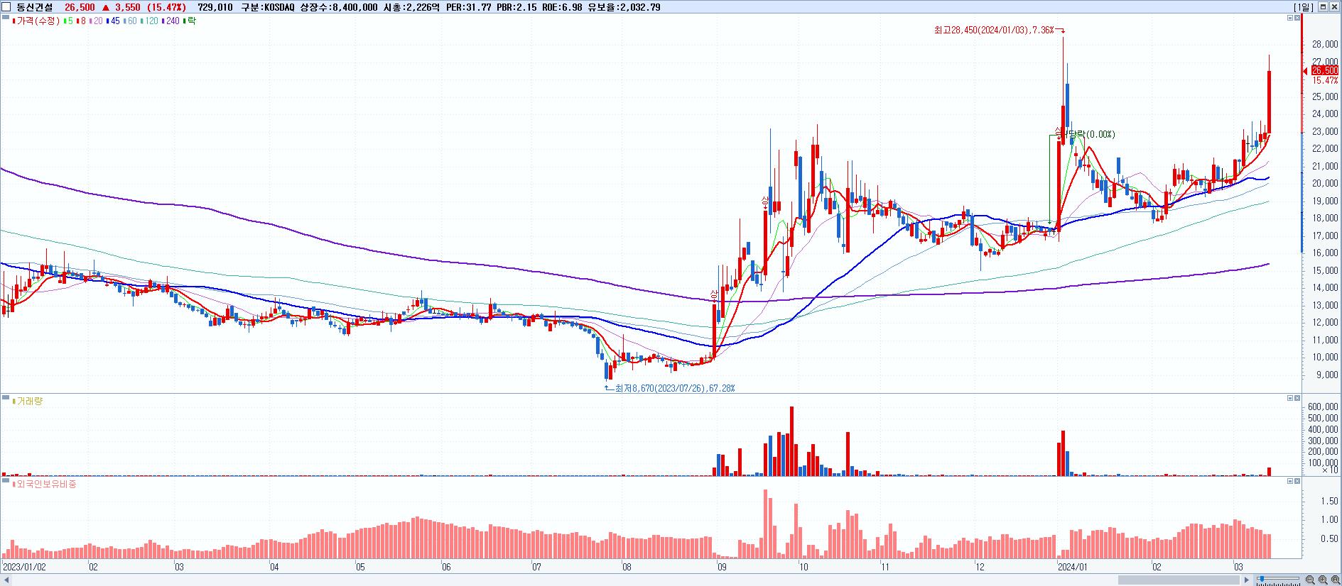 - 동신건설 (26,500원 ▲ 15.47% , 시총: 2,226억, 거래량: 729,010, 거래대금:188억)
