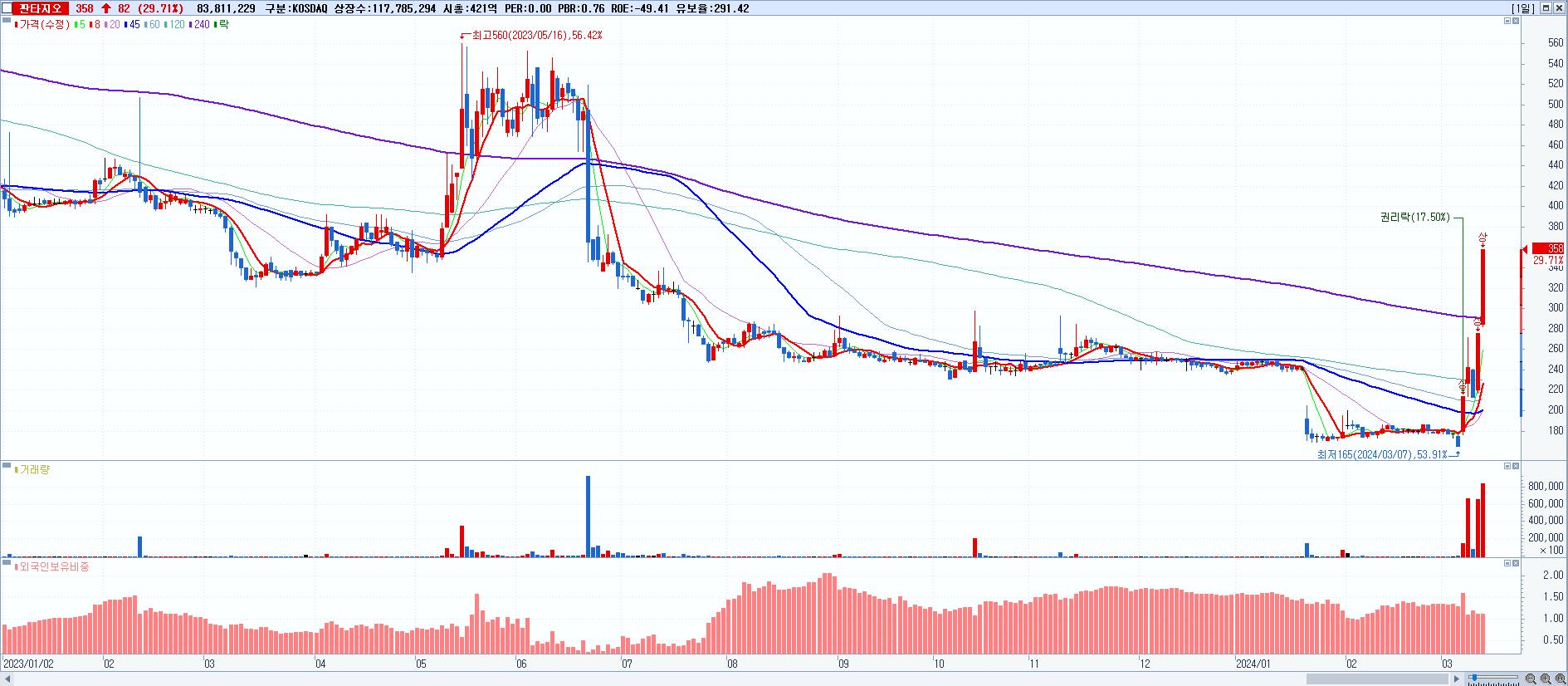 - 판타지오 (358원 ▲ 29.71% , 시총: 422억, 거래량: 83,811,229, 거래대금:285억)