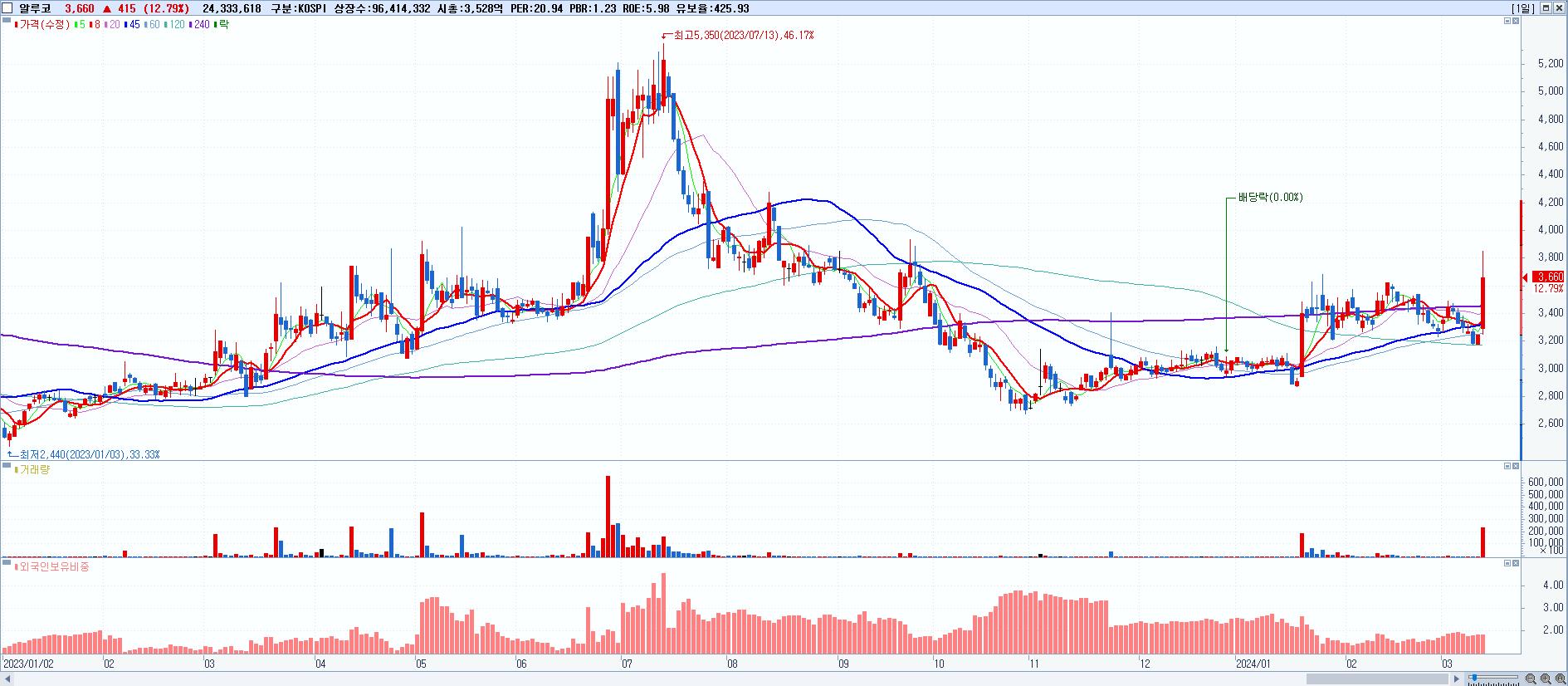 - 알루코 (3,660원 ▲ 12.79% , 시총: 3,529억, 거래량: 24,333,618, 거래대금:895억)