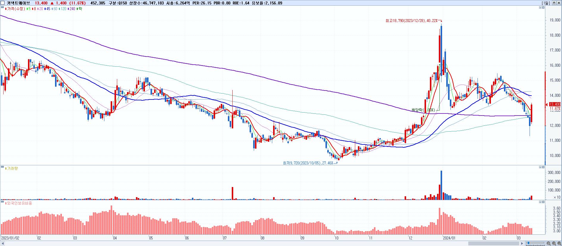 - 커넥트웨이브 (13,400원 ▲ 11.67% , 시총: 6,264억, 거래량: 452,385, 거래대금:59억)
