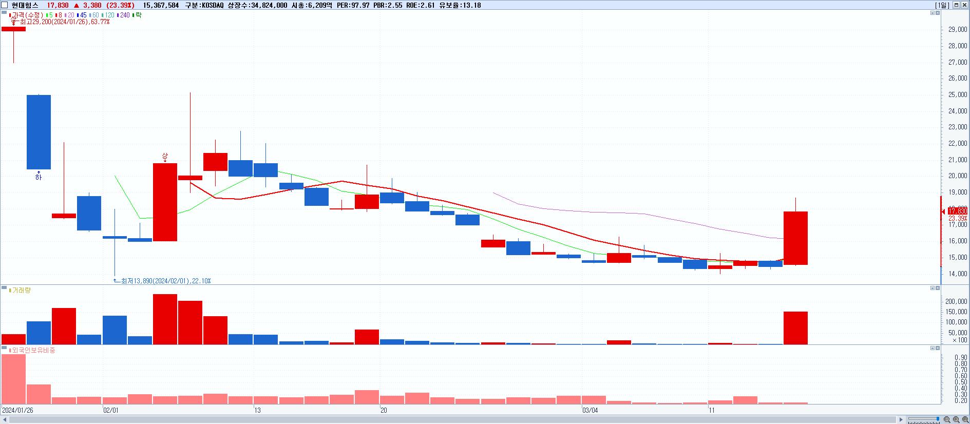 - 현대힘스 (17,830원 ▲ 23.39% , 시총: 6,209억, 거래량: 15,367,584, 거래대금:2,694억)