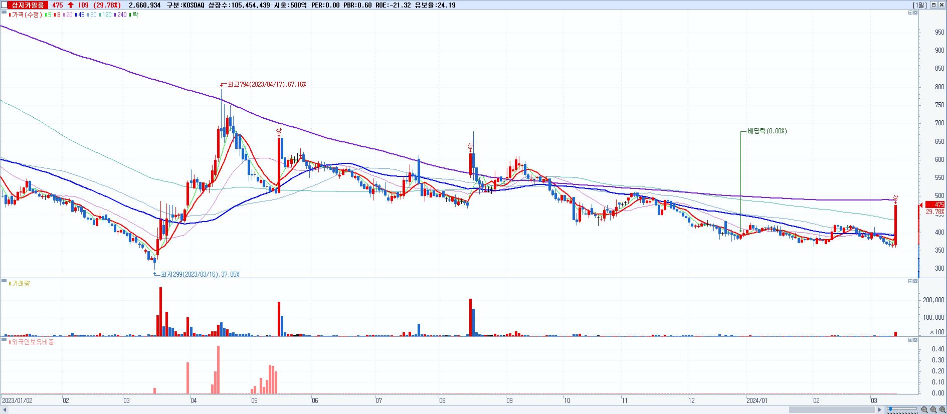 - 상지카일룸 (475원 ▲ 29.78% , 시총: 501억, 거래량: 2,660,934, 거래대금:11억)