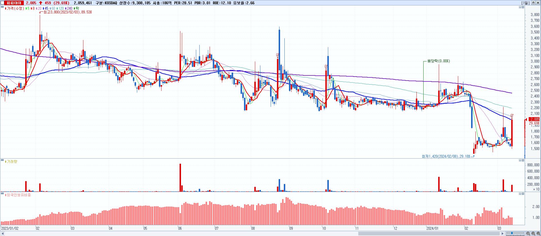 - 피피아이 (2,005원 ▲ 29.69% , 시총: 187억, 거래량: 2,059,461, 거래대금:40억)