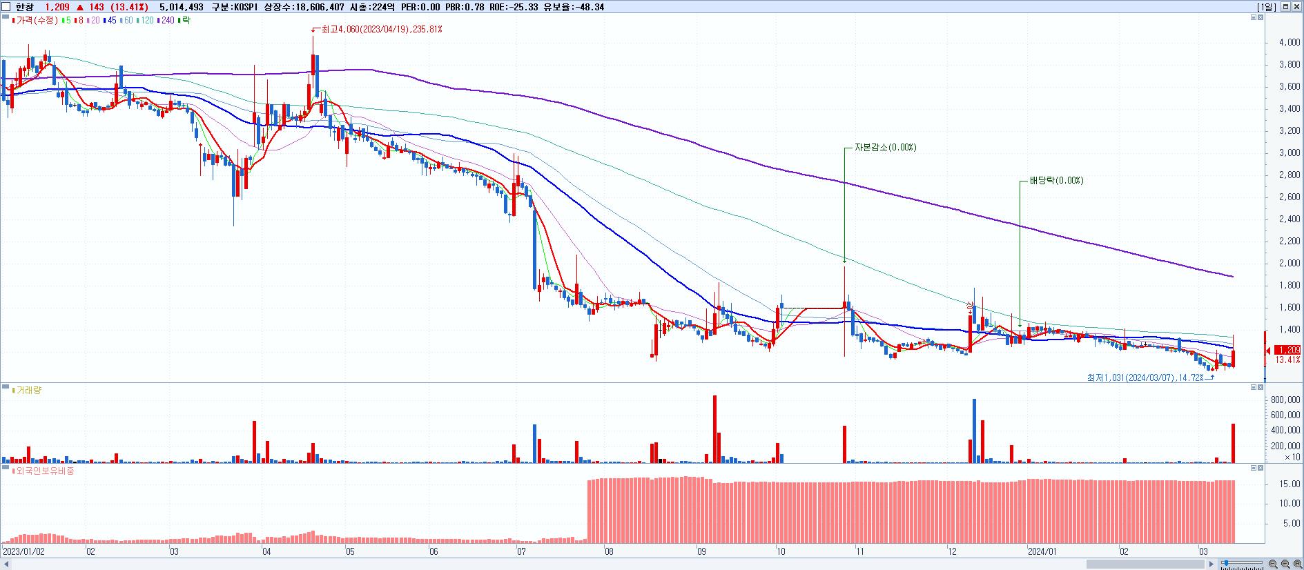 - 한창 (1,209원 ▲ 13.41% , 시총: 225억, 거래량: 5,014,493, 거래대금:64억)