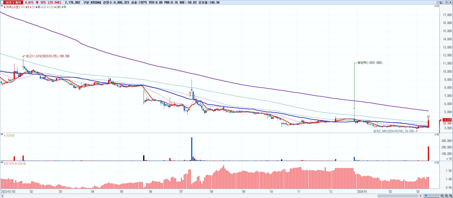 2.아이오케이 4,015원 ▲ 29.94% (KOSDAQ, 078860)
