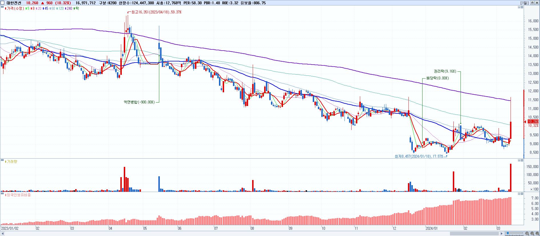 - 대한전선 (10,260원 ▲ 10.32% , 시총: 12,768억, 거래량: 16,971,712, 거래대금:1,813억)