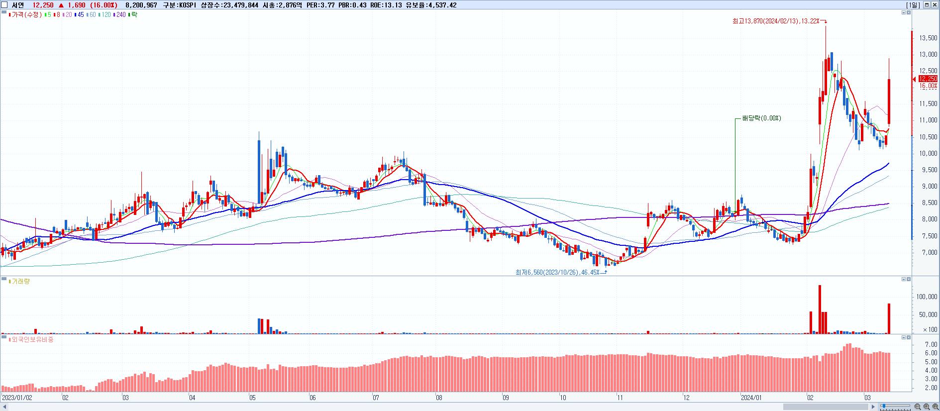 - 서연 (12,250원 ▲ 16% , 시총: 2,876억, 거래량: 8,200,967, 거래대금:999억)