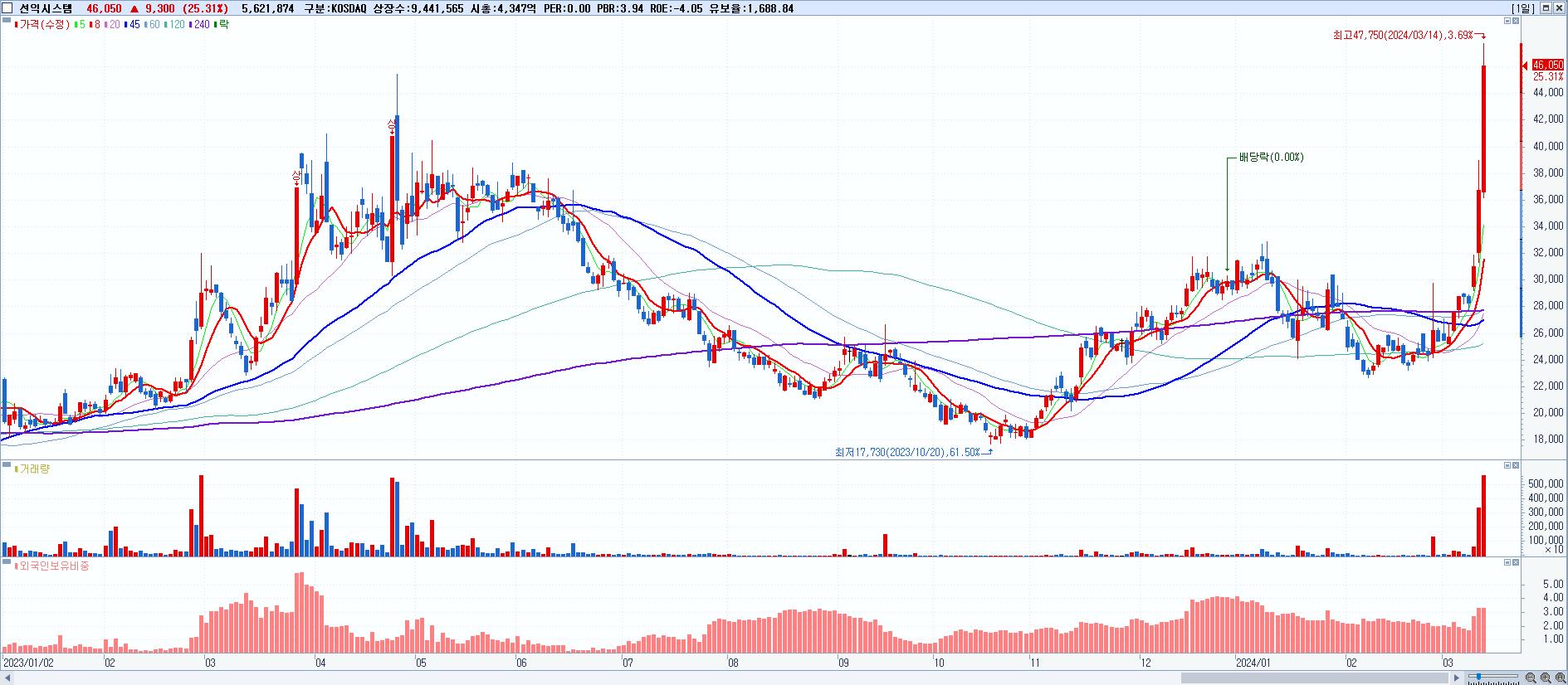 - 선익시스템 (46,050원 ▲ 25.31% , 시총: 4,348억, 거래량: 5,621,874, 거래대금:2,464억)