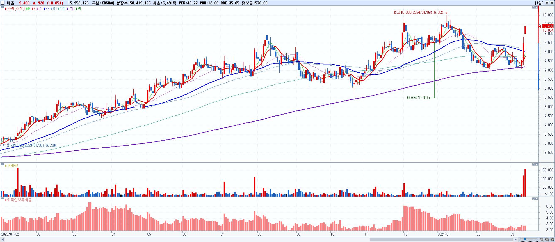 - 비올 (9,400원 ▲ 10.85% , 시총: 5,491억, 거래량: 15,952,176, 거래대금:1,468억)