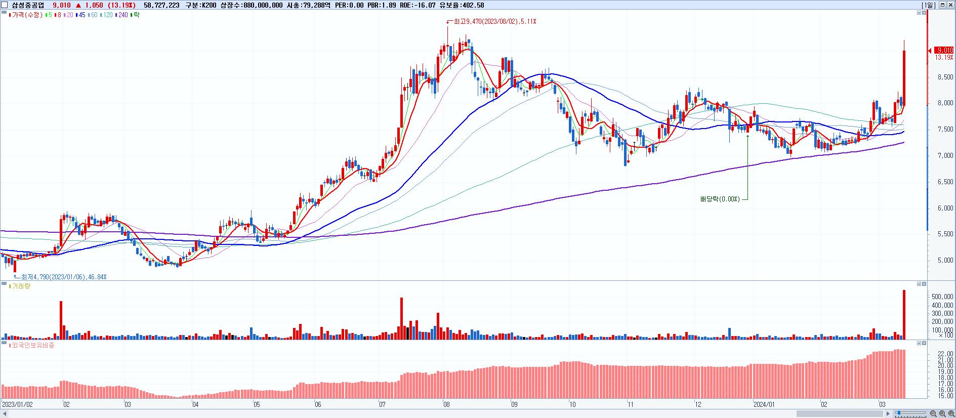- 삼성중공업 (9,010원 ▲ 13.19% , 시총: 79,288억, 거래량: 58,727,223, 거래대금:5,192억)