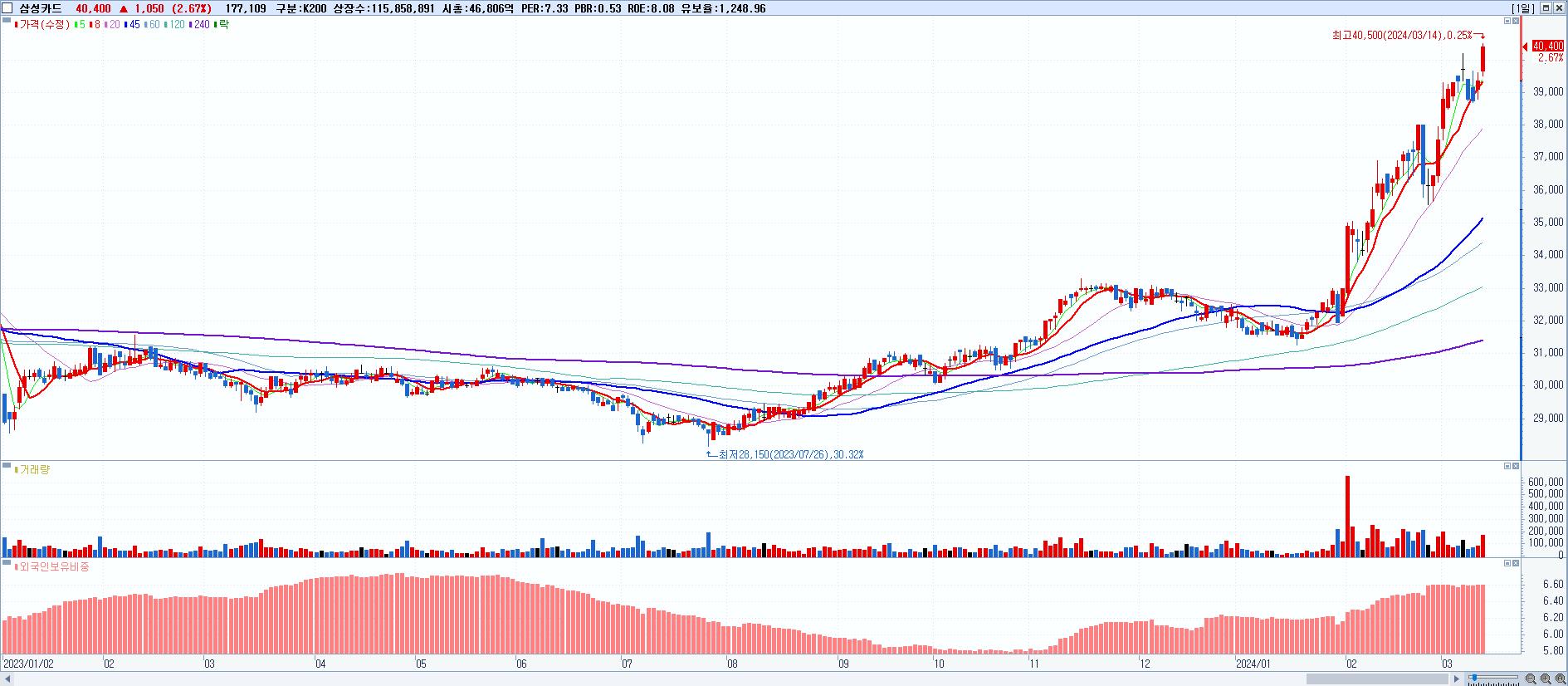 - 삼성카드 (40,400원 ▲ 2.67% , 시총: 46,807억, 거래량: 177,109, 거래대금:71억, KOSPI)