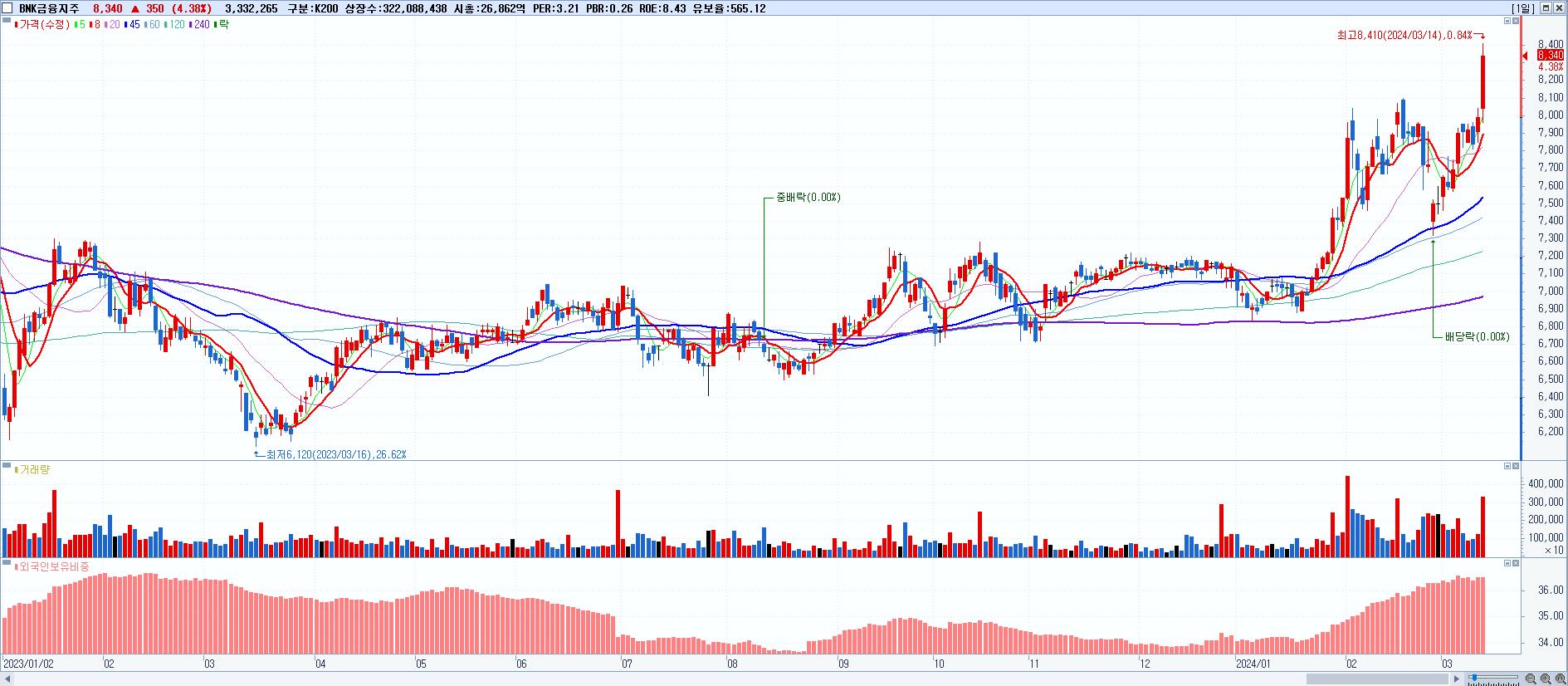 - BNK금융지주 (8,340원 ▲ 4.38% , 시총: 26,862억, 거래량: 3,332,265, 거래대금:274억, KOSPI)