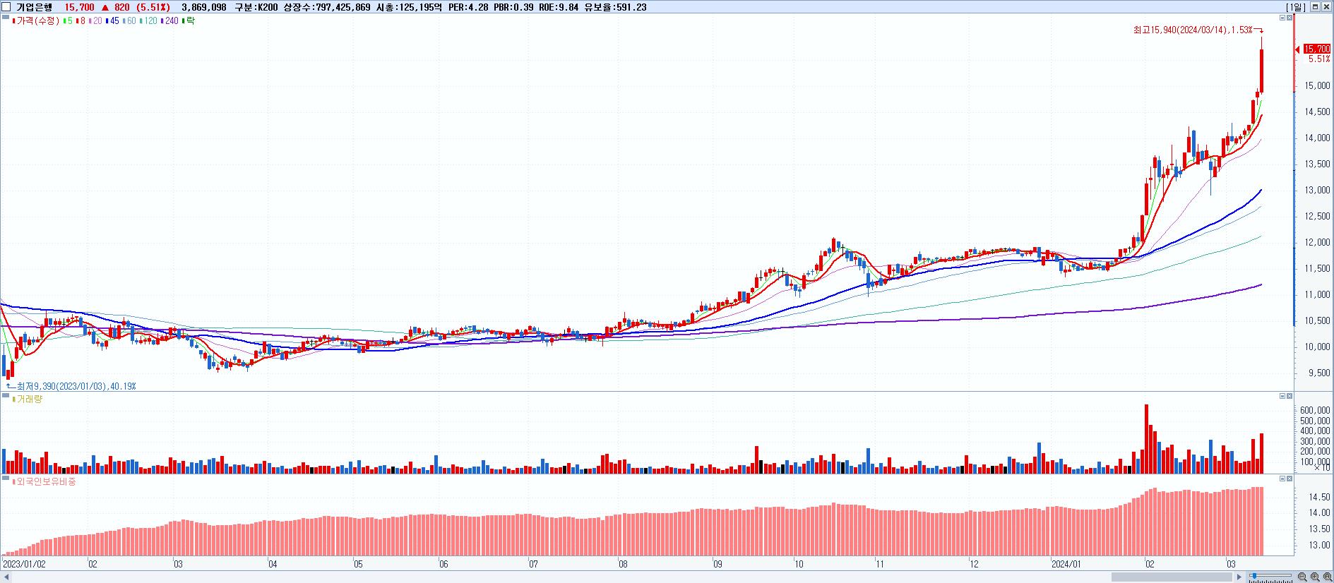 - 기업은행 (15,700원 ▲ 5.51% , 시총: 125,196억, 거래량: 3,869,098, 거래대금:598억, KOSPI)