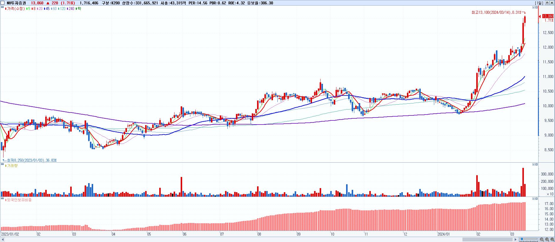 - NH투자증권 (13,060원 ▲ 1.71% , 시총: 43,316억, 거래량: 1,716,406, 거래대금:223억, KOSPI)