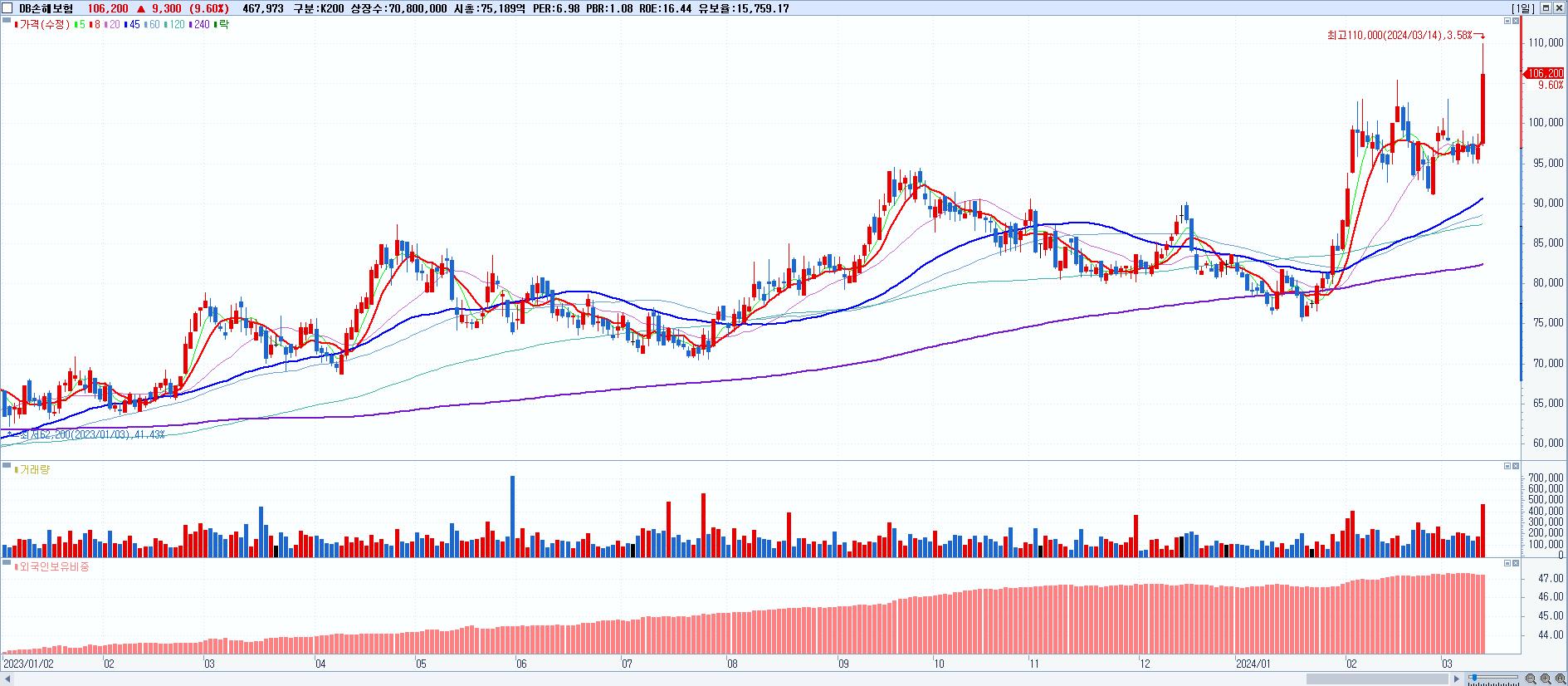 - DB손해보험 (106,200원 ▲ 9.6% , 시총: 75,190억, 거래량: 512,973, 거래대금:530억, KOSPI)