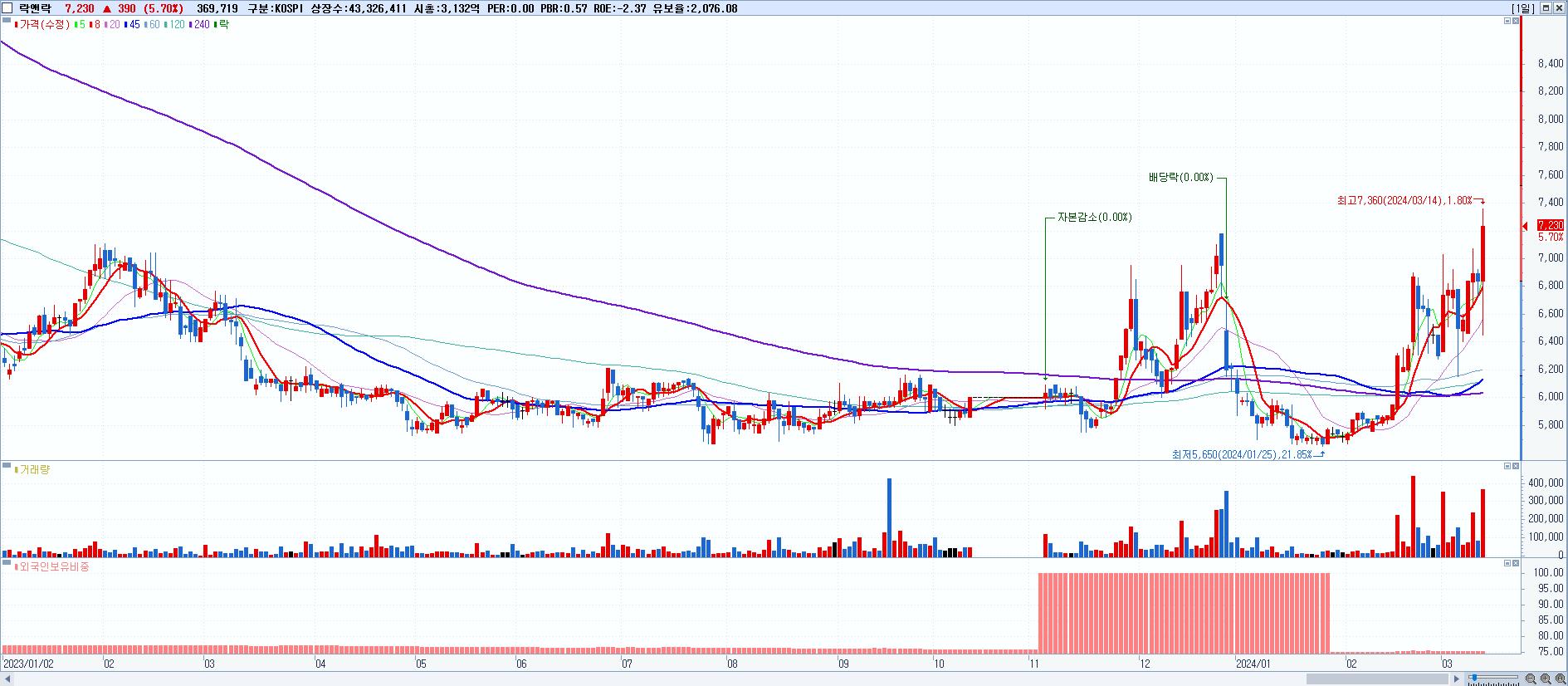 - 락앤락 (7,230원 ▲ 5.7% , 시총: 3,132억, 거래량: 369,719, 거래대금:26억, KOSPI)