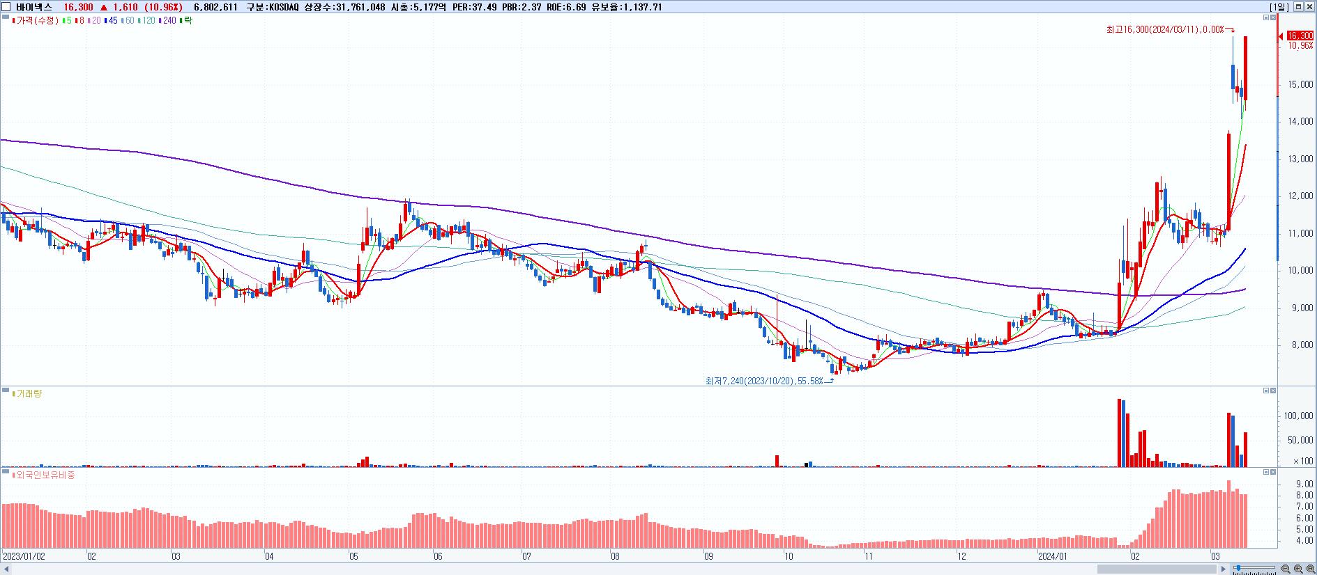 바이넥스 16,300원 ▲ 10.96% (KOSDAQ, 053030)
