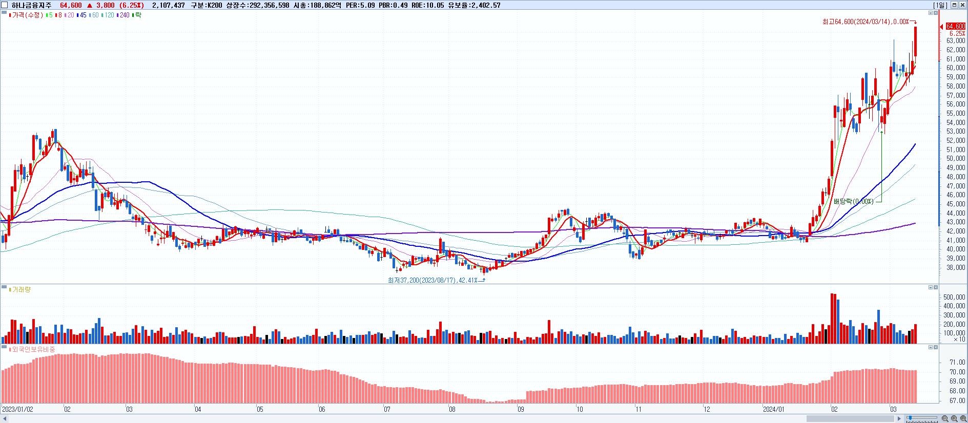 - 하나금융지주 (64,600원 ▲ 6.25% , 시총: 188,862억, 거래량: 2,400,491, 거래대금:1,522억, KOSPI)