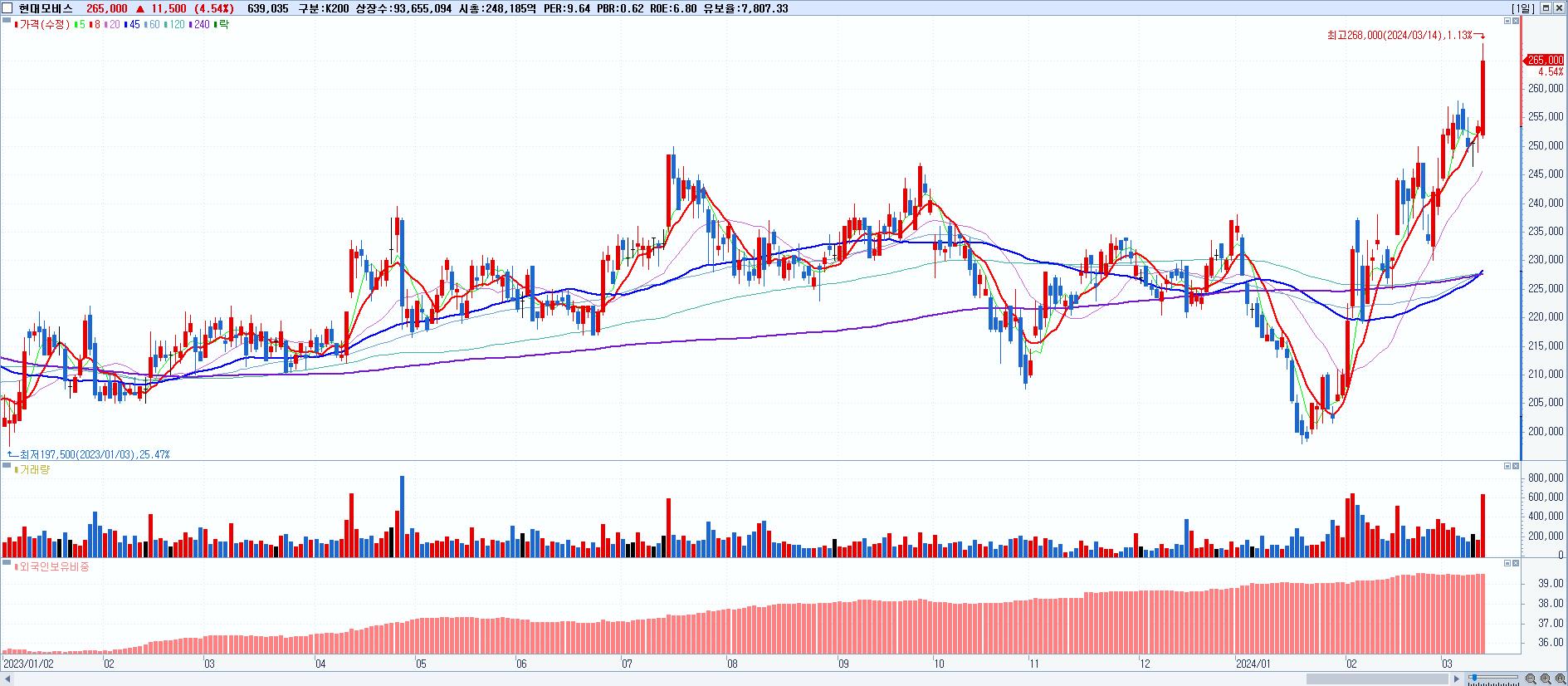 - 현대모비스 (265,000원 ▲ 4.54% , 시총: 248,186억, 거래량: 639,035, 거래대금:1,680억, KOSPI)