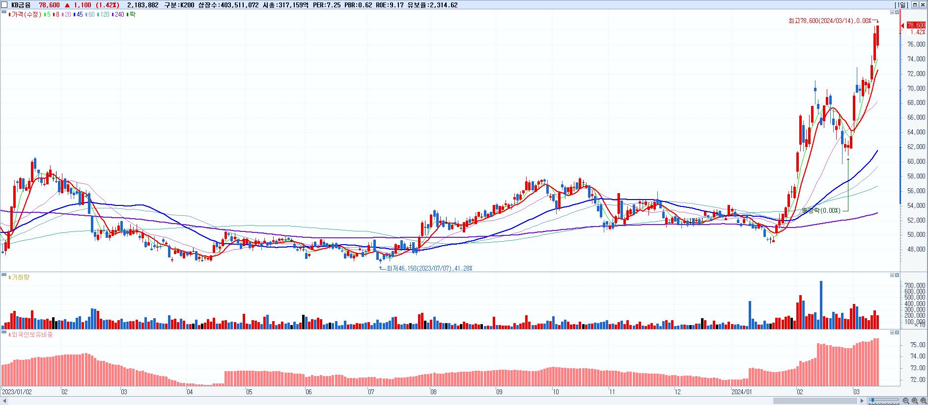 - KB금융 (78,600원 ▲ 1.42% , 시총: 317,160억, 거래량: 2,262,798, 거래대금:1,751억, KOSPI)