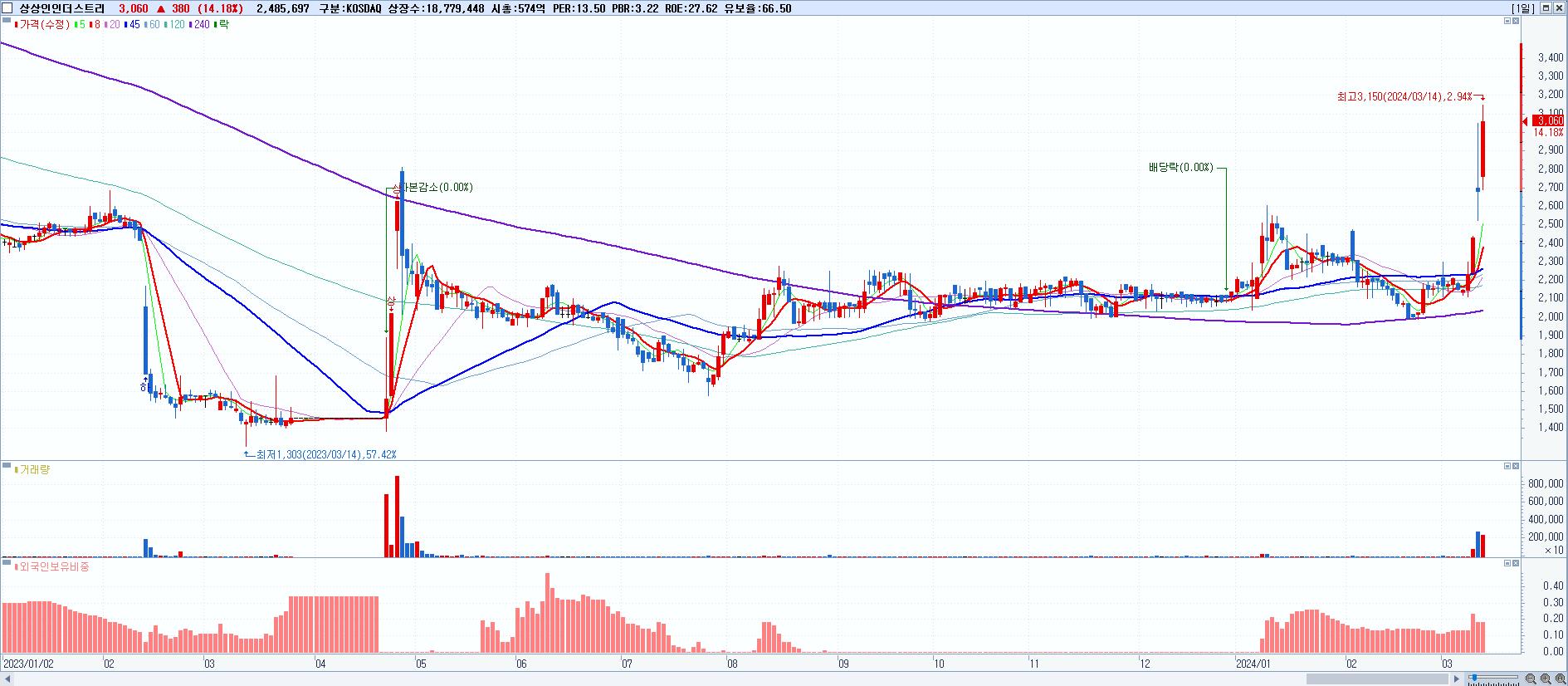 - 상상인인더스트리 (3,060원 ▲ 14.18% , 시총: 575억, 거래량: 2,485,697, 거래대금:74억, KOSDAQ)